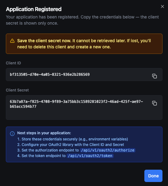 The client secret is displayed only once in this dialog. It cannot be retrieved later — the secret is stored as a hash and the plaintext is never kept. If you lose the secret, you must delete the client and create a new one.