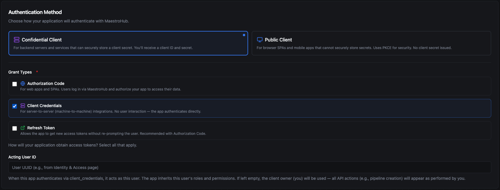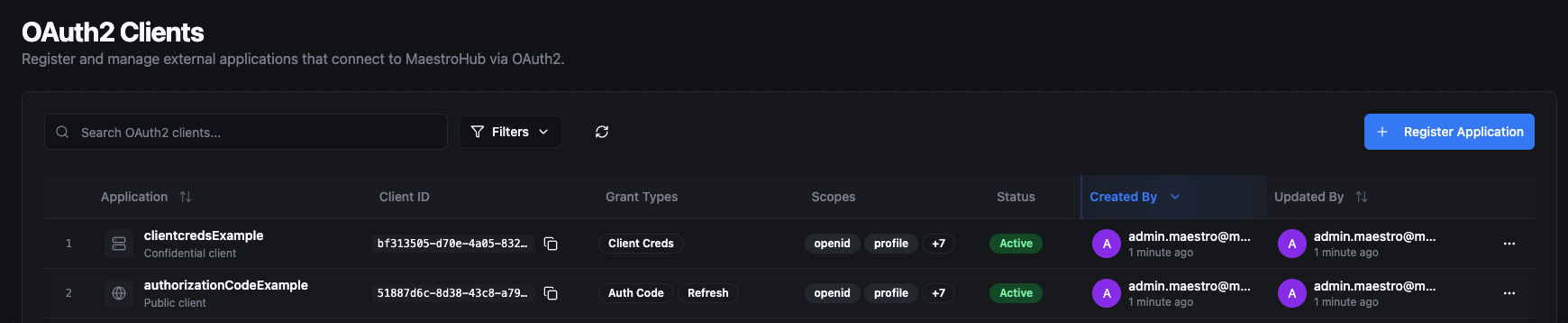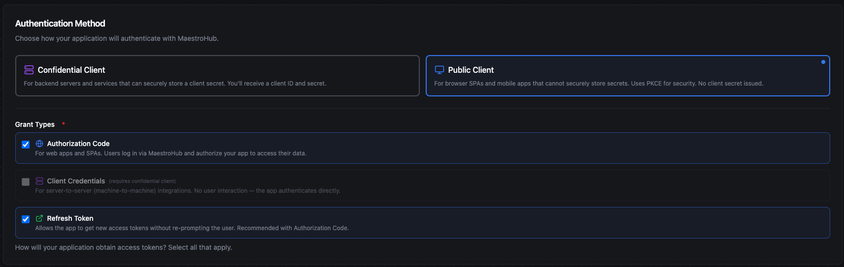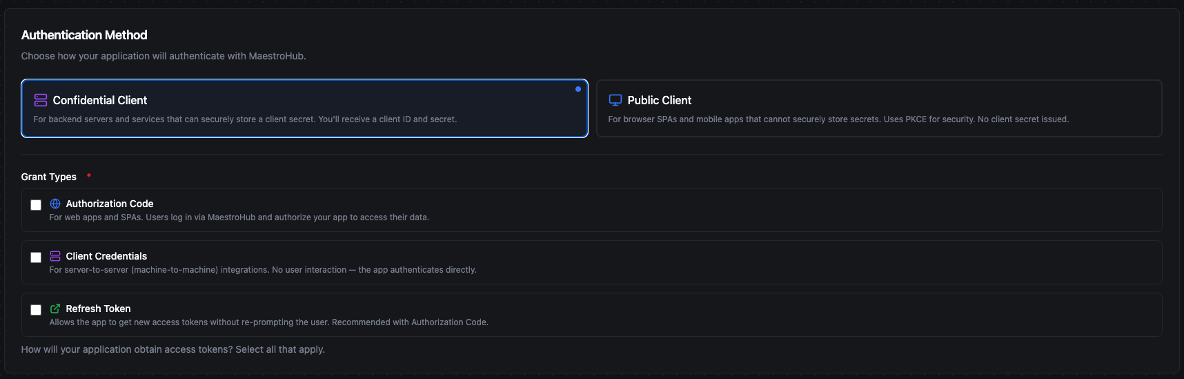 Below are two end-to-end examples that walk through the most common grant types. Each example shows how to register the client in MaestroHub and how the application uses it to obtain an access token.