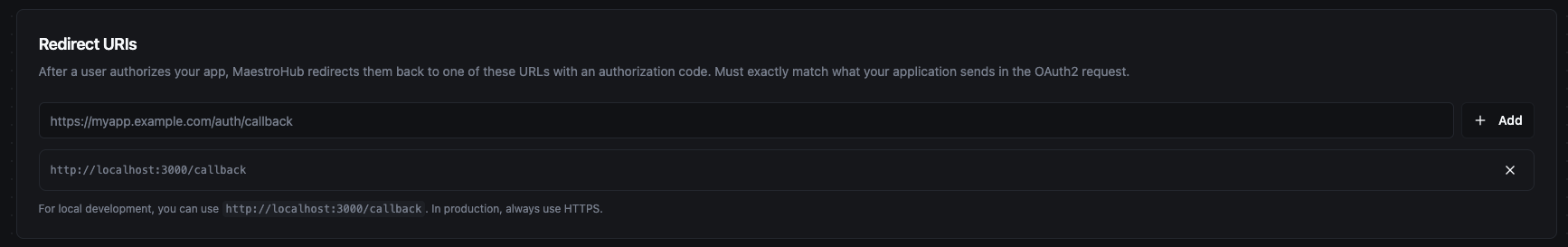 Required when the Authorization Code grant is selected. These are the URLs where MaestroHub redirects users after they authorize the application.