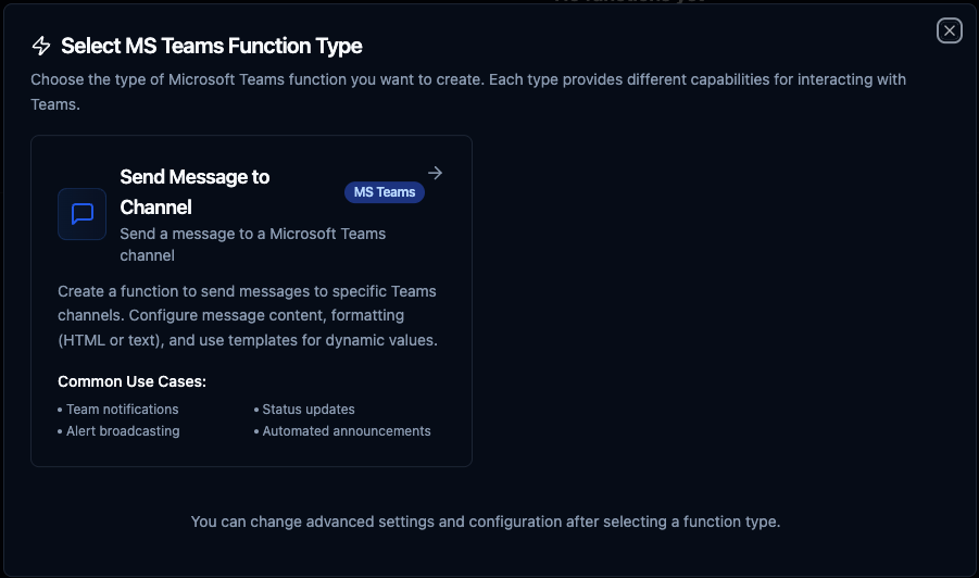 - Select Microsoft Teams as the function type