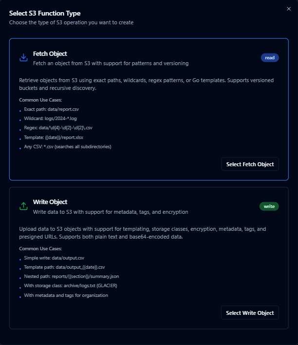 - Choose S3 Fetch or S3 Write as the function type