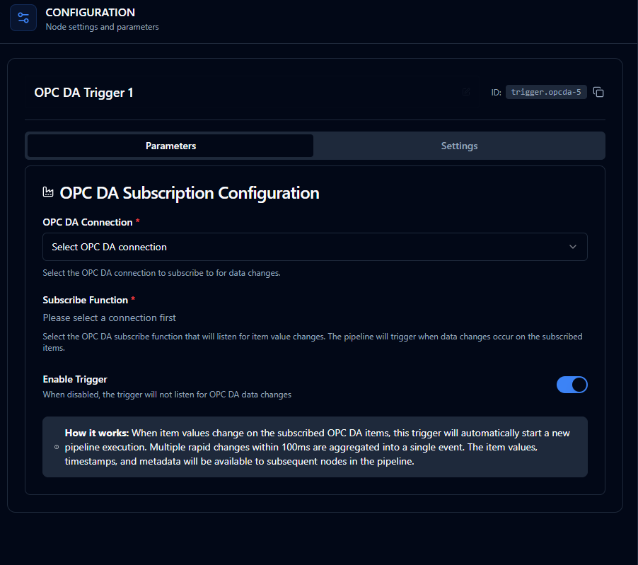 The OPC DA Trigger Node automatically initiates MaestroHub pipelines when OPC DA item values change. Unlike polling-based approaches, this trigger provides real-time event-driven automation with intelligent debouncing—multiple rapid item changes within 100ms are aggregated into a single pipeline execution with the latest values for all affected items.