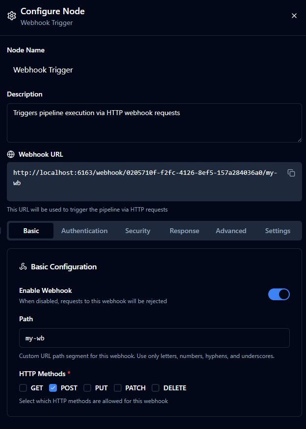 HTTP Methods (httpMethods) | String[] (GET, POST, PUT, PATCH, DELETE) | ['POST'] | Allowed HTTP methods for this webhook. At least one is required. |